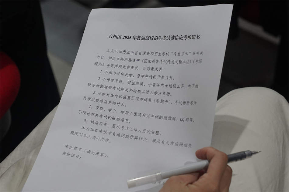 此外,學(xué)校還組織全體考生簽署了《吉州區(qū)2025年普通高校招生考試誠信應(yīng)考承諾書》。大家在承諾書上鄭重簽名,承諾將嚴(yán)格遵守考試紀(jì)律,誠信應(yīng)考,以實際行動維護(hù)高考的公平公正。
