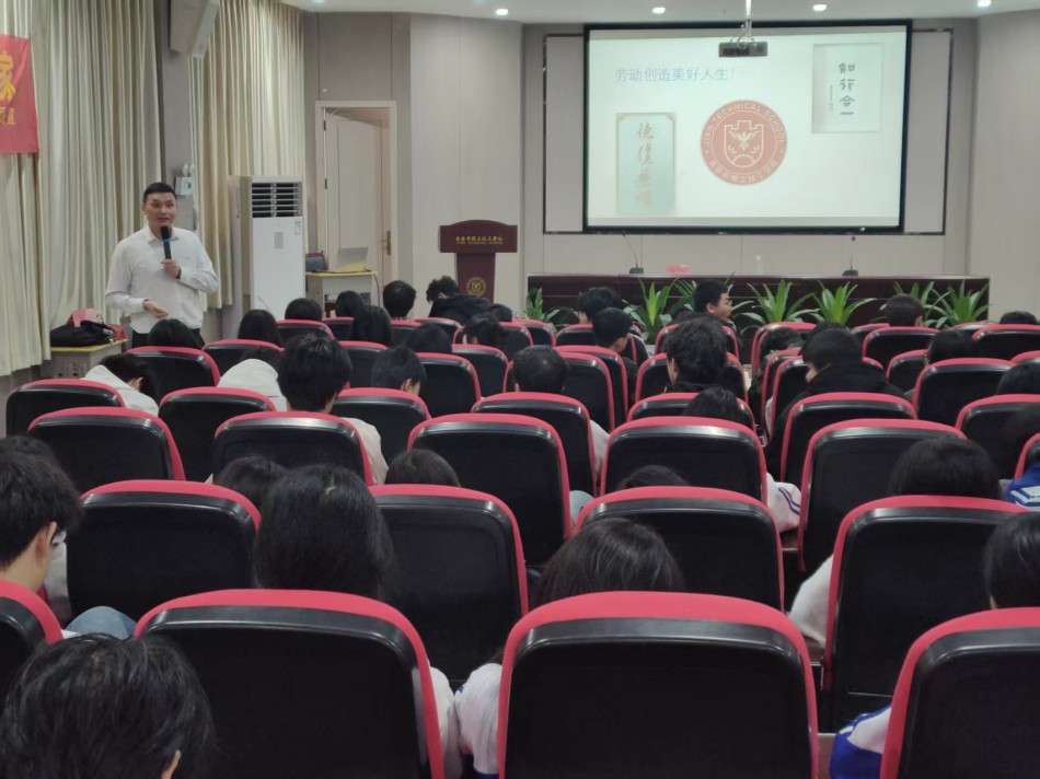 宣講環(huán)節(jié)中,勞動模范姚海彪結(jié)合自身三十余年的從業(yè)經(jīng)歷,講述了從一名普通技術(shù)工人成長為行業(yè)領軍人物的奮斗歷程。他分享道,初入職場時,自己也曾因技術(shù)不熟練而受挫,但憑借 “不服輸、肯鉆研” 的勁頭,利用業(yè)余時間反復琢磨操作技巧,攻克了一個又一個技術(shù)難題,最終在制造業(yè)取得重大突破,獲得很多榮譽。“技能沒有捷徑,唯有腳踏實地、精益求精,才能在平凡的崗位上創(chuàng)造不平凡的價值。” 樸實的話語中蘊含著深刻的人生哲理,引發(fā)全場師生的強烈共鳴。