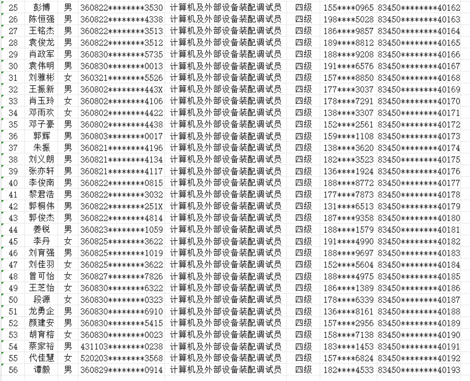 按照《贛人社規(guī)〔2022〕7號(hào)》文件精神。我校于2025年10月24日開展了計(jì)算機(jī)及外部設(shè)備裝配調(diào)試員(計(jì)算機(jī)整機(jī)裝配調(diào)試員)等級(jí)認(rèn)定,共58人(四級(jí)),通過(guò)認(rèn)定考核56人?,F(xiàn)對(duì)認(rèn)定考核合格人員進(jìn)行公示。(名單附后)
