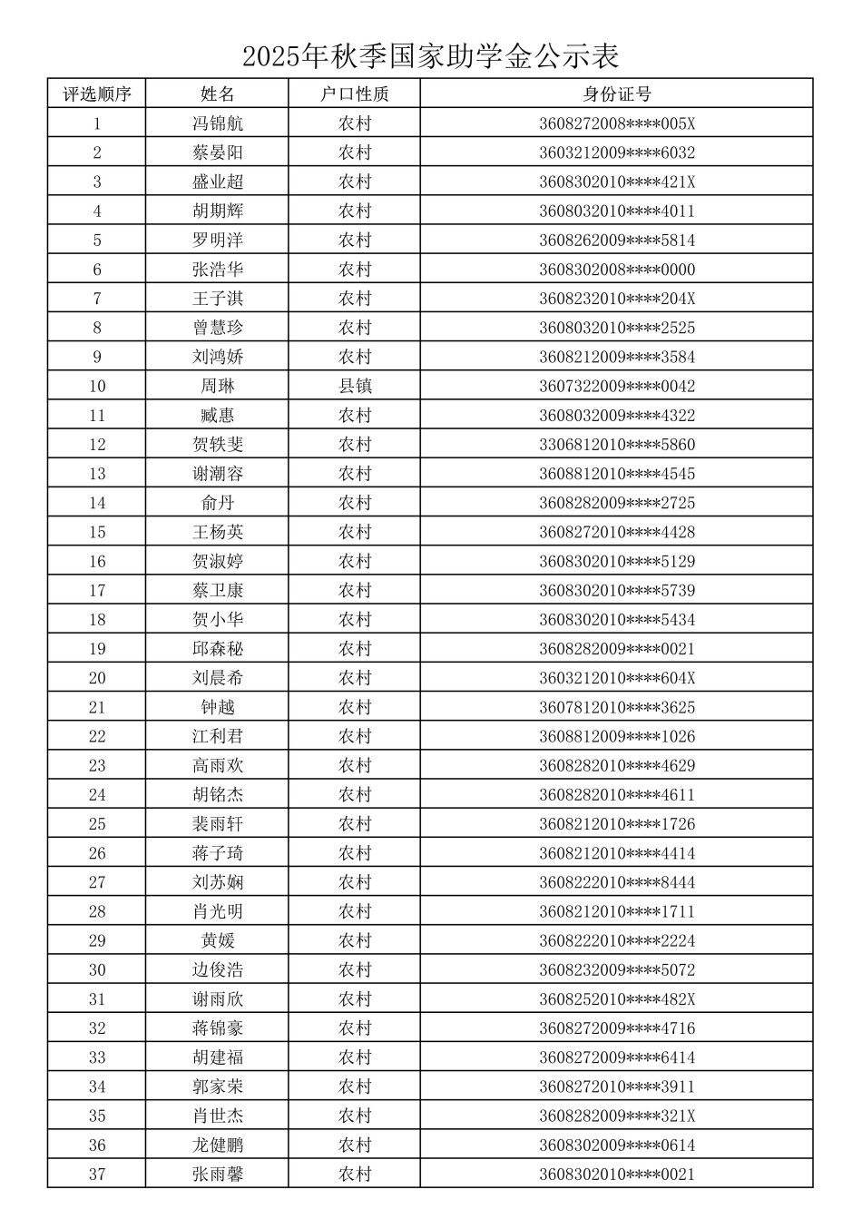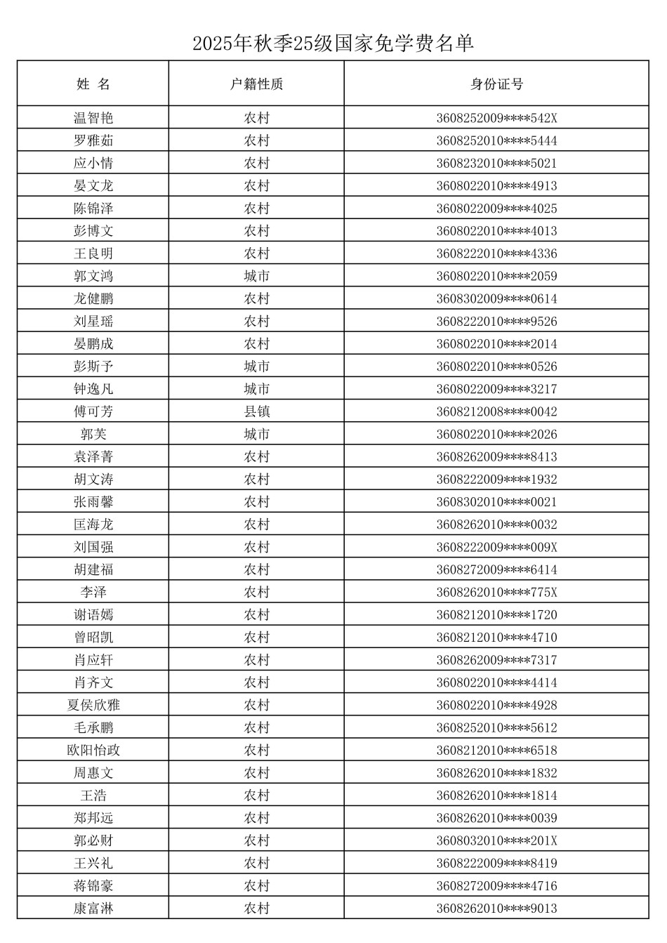 關于吉安市理工技工學校2025年秋季學生資助名單的公示